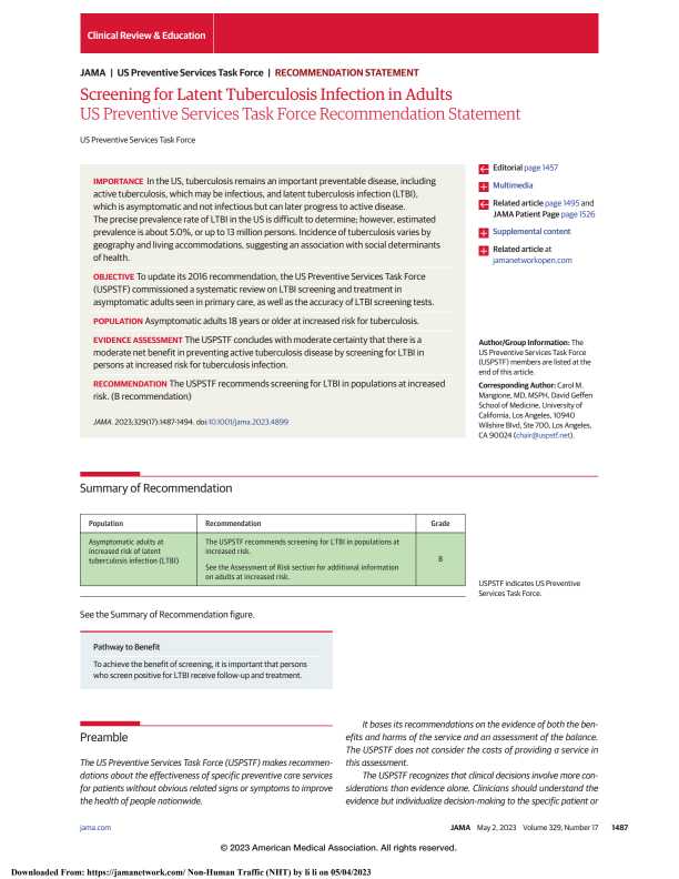Screening for Latent Tuberculosis Infection in Adults