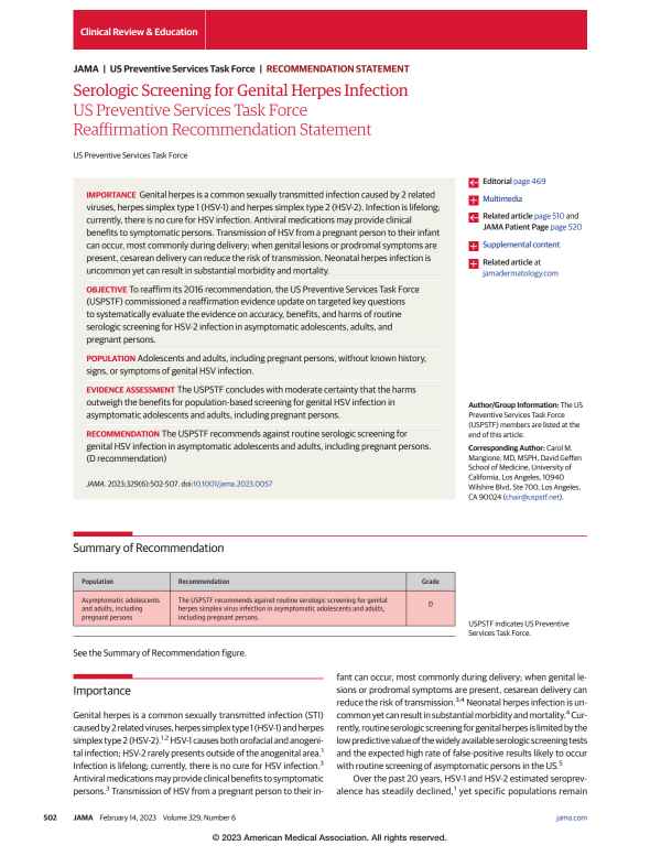 Serologic Screening for Genital Herpes Infection