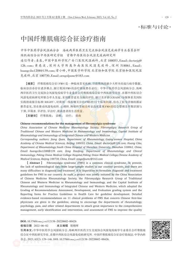 临床诊治亦存在诸多难点,制订我国 FMS的诊疗指南势在必行。中华中医药学会风湿病分会、海峡
