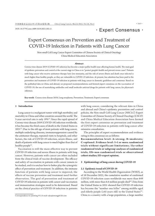 染的脆弱人群。目前国内指南和共识较少关注肺癌患者新型冠状病毒感染的预防和治疗。本文基于已发表的国内外资