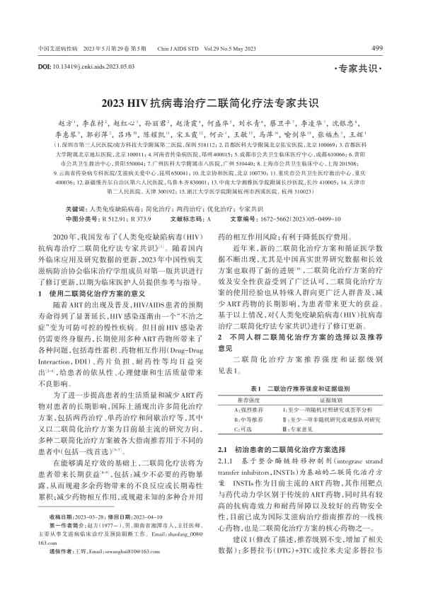 摘要: 2020年,我国发布了《人类免疫缺陷病毒(HIV)抗病毒治疗二联简化疗法专家共识》[1]。随着国内外临床应用及研究数据的更新,2023 年中国性病艾滋病防治协会临床治疗学组成员对第一版共识进行了修订更新,以期为临床医护人员提供参考与指导。