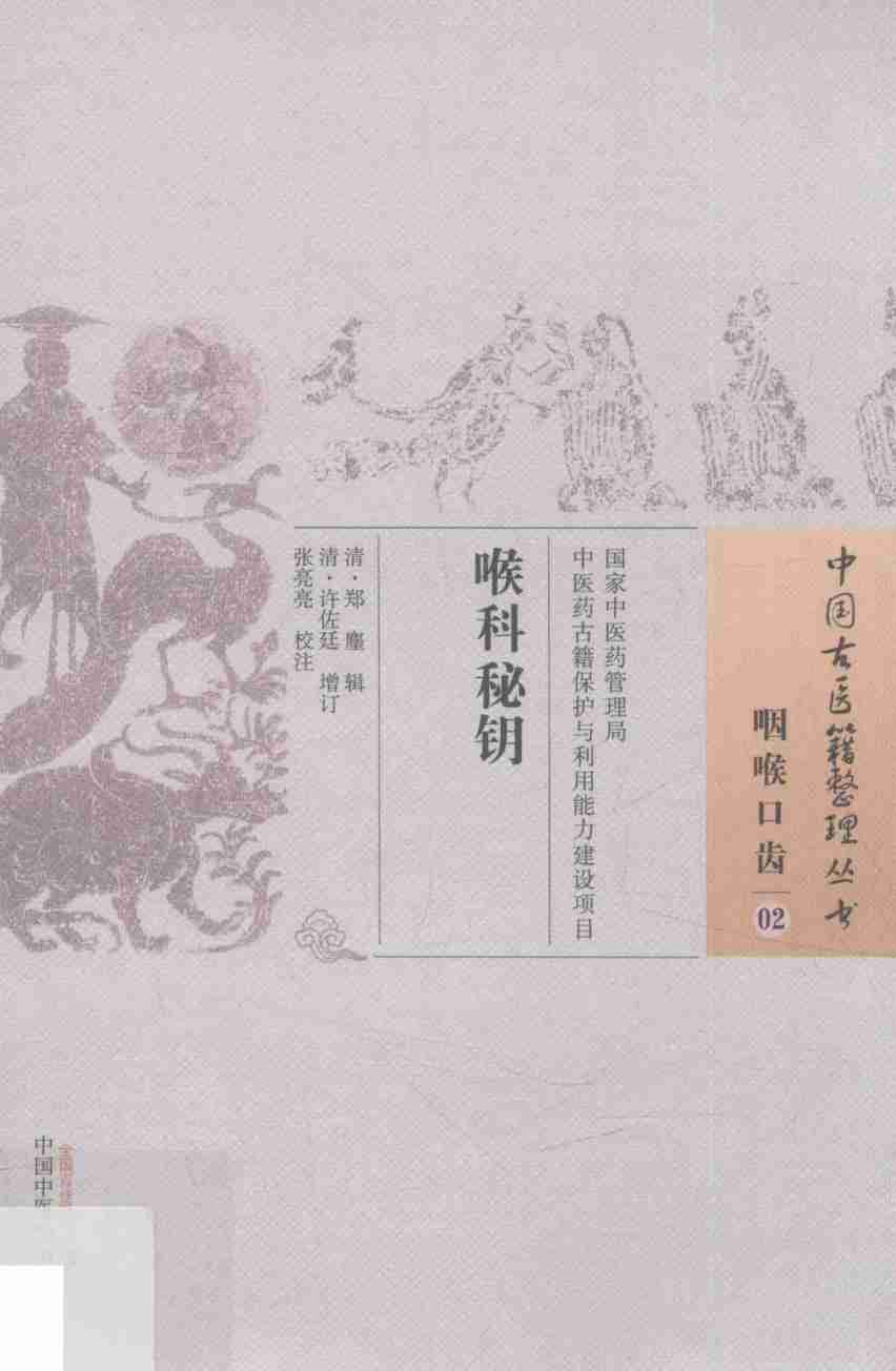 《喉科秘钥》二卷。清代医家郑麈辑口齿,经许佐廷增订并刊行。上卷喉症要说,叙述咽喉病辨证概要及其方药,有歌诀二十二首,并列通治之方十二则、外用秘方十八种、应用汤药丸散十八种。……