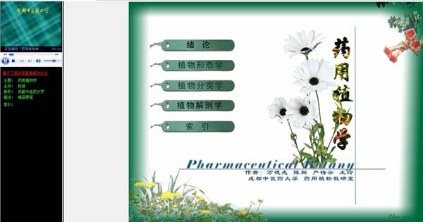 “药用植物学”的主讲教师在授讲授药用植物学课程中,采用了现代的网络技术、计算机多媒体等教学手段,结合该学科的特点,充分利用大量的药用植物彩色图片和与中药品种品质相关的丰富详实的研究成果,增强了直观教学和提高了教学效果。讲课中语言流畅,用语规范;讲授内容融具有科学性、先进性和趣味性为一体,同时亦反应出药用植物学最新的研究成果。 |